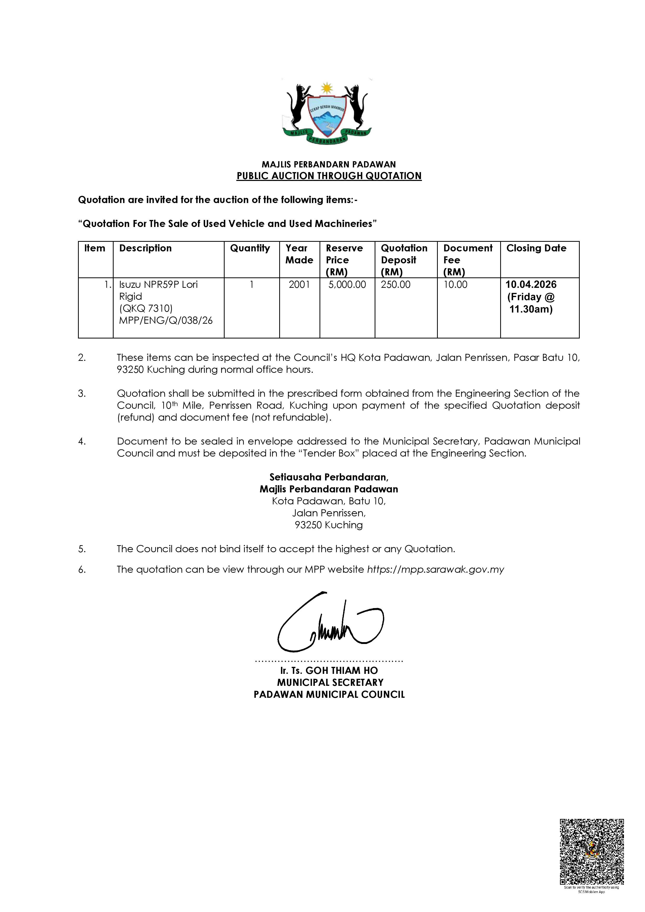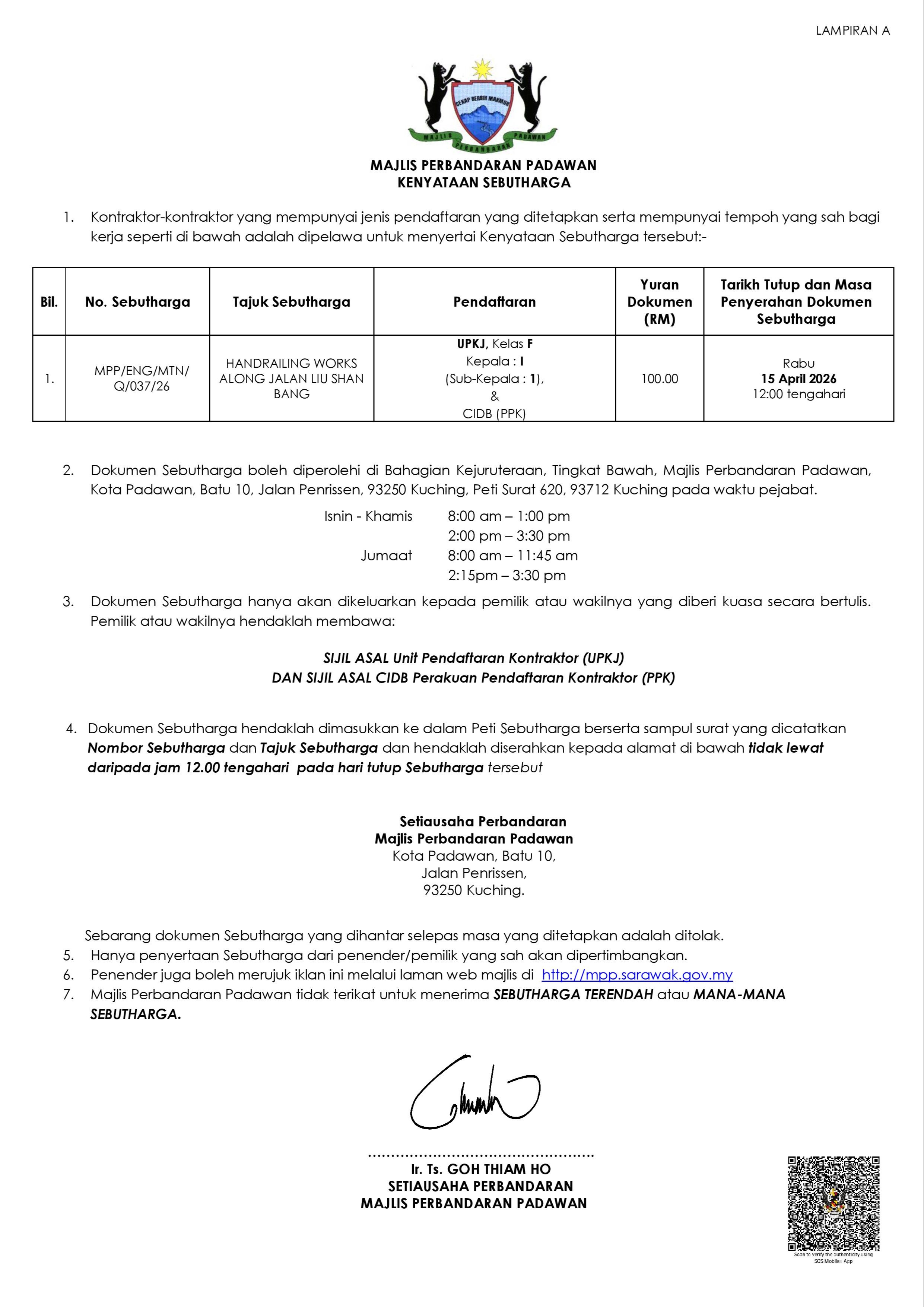 KENYATAAN SEBUTHARGA: HANDRAILING WORKS ALONG JALAN LIU SHAN BANG: TARIKH TUTUP 15/04/2026